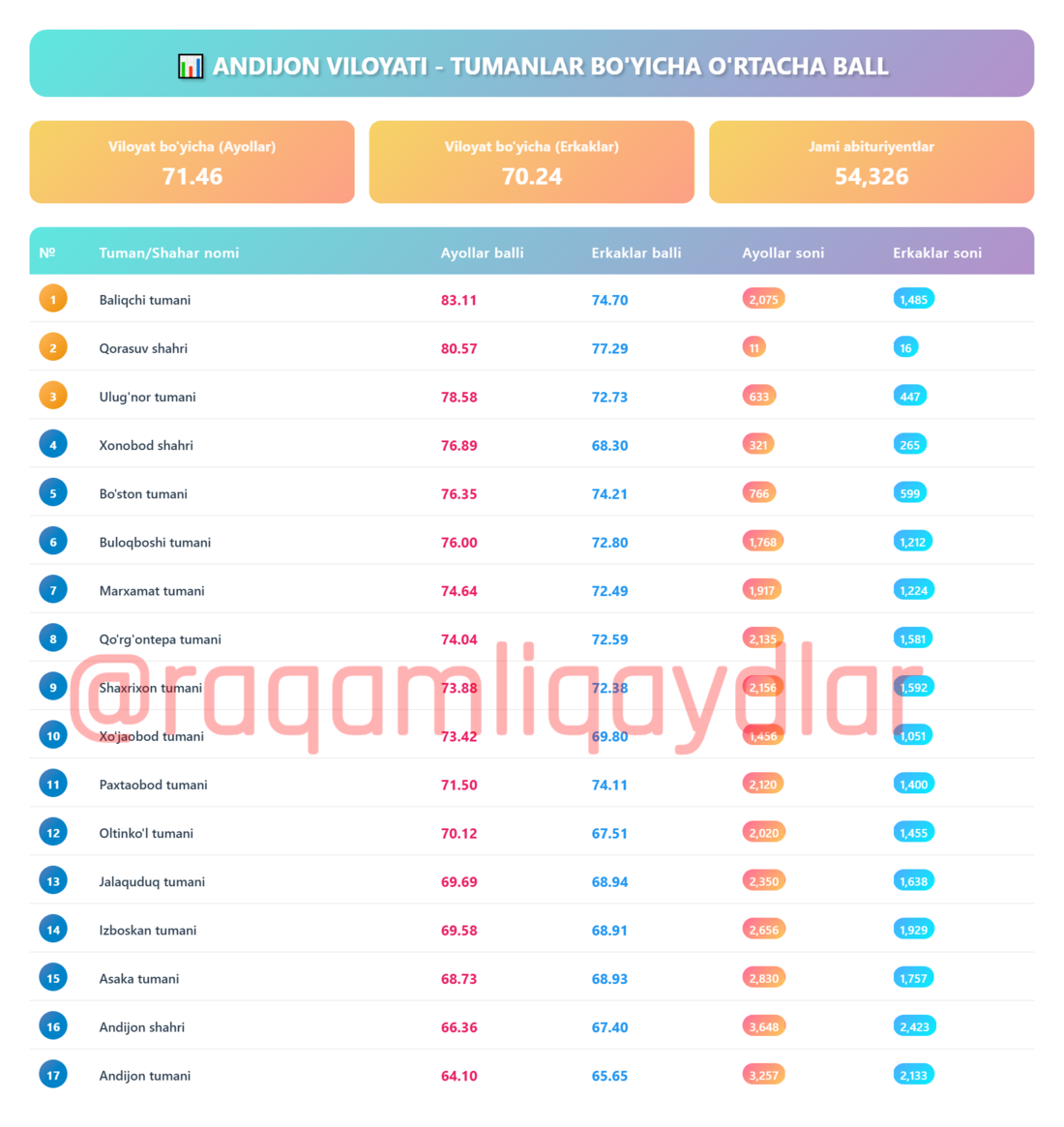 - Ayrim tumanlarda ayollar ancha yuqori natija ko‘rsatgan (masalan, Baliqchi, Ulug‘nor).