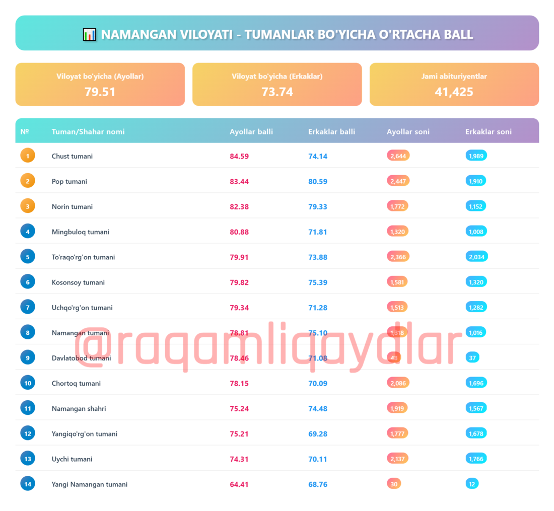 2025-yilda Namangan viloyatidan 41 425 nafar abituriyent test sinovlarida qatnashdi. Ayollarning o‘rtacha bali 79.51, erkaklarniki esa 73.74 bo‘lib, gender tafovuti sezilarli ko‘rinishda ayollar foydasiga bo‘ldi.