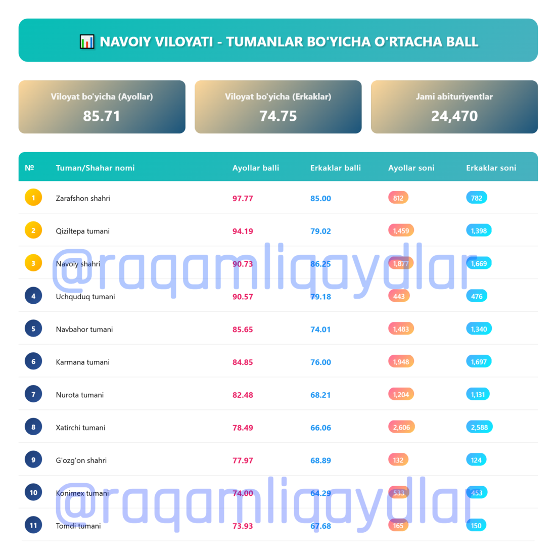 Navoiy viloyatidan 24 470 nafar abituriyent test topshirdi. Ayollarning o‘rtacha bali 85.71, erkaklarniki esa 74.75 bo‘lib, bu viloyat respublika miqyosida eng yuqori natija ko‘rsatgan hududlardan biri hisoblanadi.