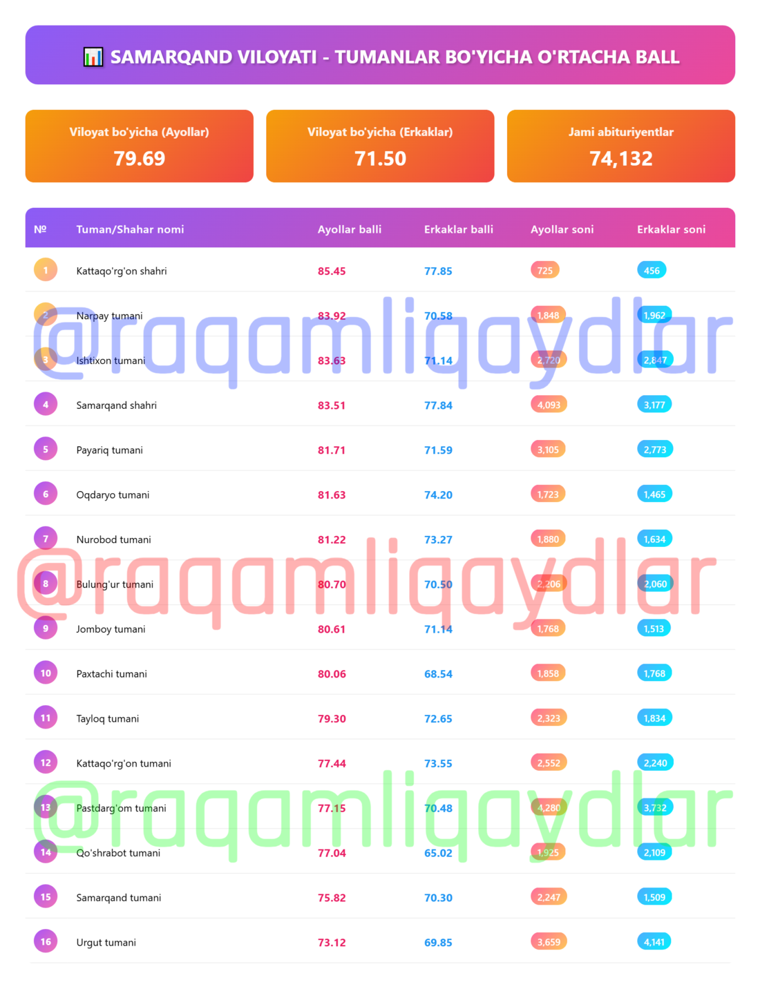 Eng yuqori natijalar – Kattaqo‘rg‘on shahri (ayollar 85.45, erkaklar 77.85), Narpay (ayollar 83.92, erkaklar 70.58), Ishtixon (ayollar 83.63, erkaklar 71.14).