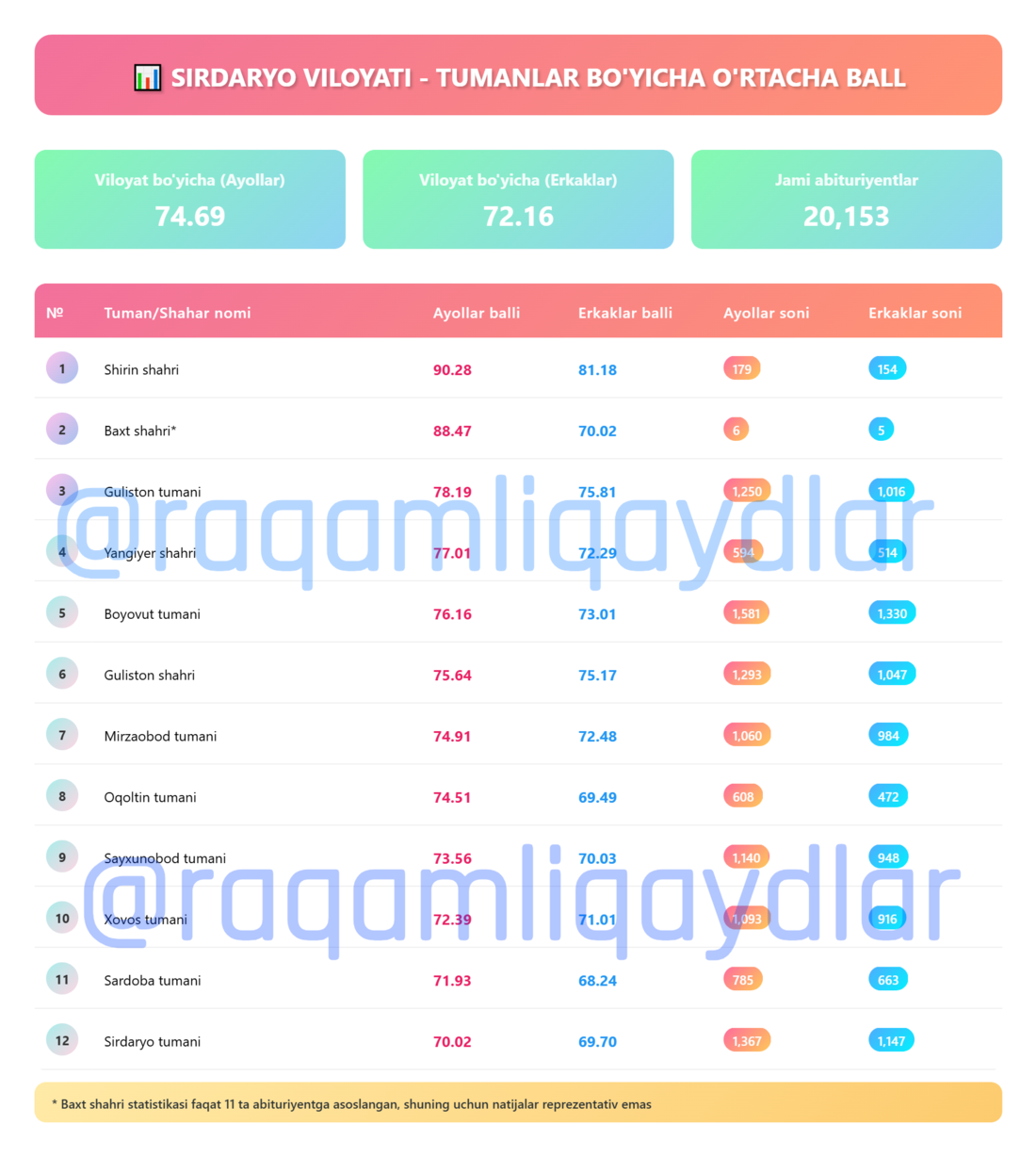 2025-yilda Sirdaryo viloyatidan 20 153 nafar abituriyent test sinovlarida qatnashdi. Ayollarning o‘rtacha bali 74.69, erkaklarniki esa 72.16