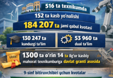 Bundan tashqari, umumiy kvotadan 1300 ta o‘rin 14 ta Ilg‘or kasbiy mahorat texnikumiga o‘quvchilarni davlat granti asosida qabul qilish uchun ajratildi.