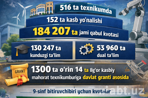 2026/2027-o‘quv yili uchun umumiy o‘rta ta’lim maktablarining 9-sinf bitiruvchilari asosida texnikumlarga kunduzgi va dual ta’lim shakllari bo‘yicha qabul parametrlari tasdiqlandi. Bu haqda Kasbiy ta’lim agentligi axborot xizmati ma’lum қилди.