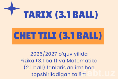 2026/2027 o‘quv yili uchun davlat oliy ta’lim tashkilotlariga kirish imtihonlarida Tarix (3.1 ball) va Chet tili (2.1 ball) fanlari majmuasi bo‘yicha jami 4 ta ta’lim yo‘nalishi mavjud.