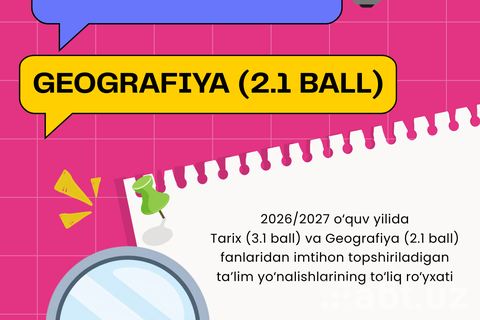 2026/2027 o‘quv yili uchun davlat oliy ta’lim tashkilotlariga kirish imtihonlarida Tarix (3.1 ball) va Geografiya (2.1 ball) fanlari majmuasi bo‘yicha jami 3 ta ta’lim yo‘nalishi mavjud.