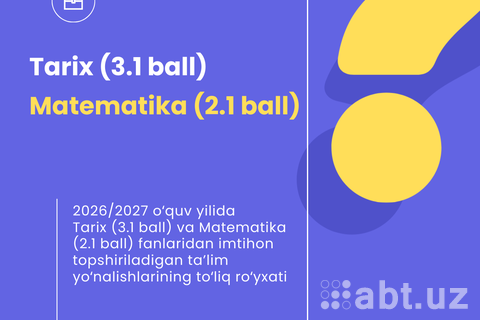 2026/2027 o‘quv yili uchun davlat oliy ta’lim tashkilotlariga kirish imtihonlarida Tarix (3.1 ball) va Matematika (2.1 ball) fanlari majmuasi bo‘yicha jami 1 ta ta’lim yo‘nalishi mavjud.