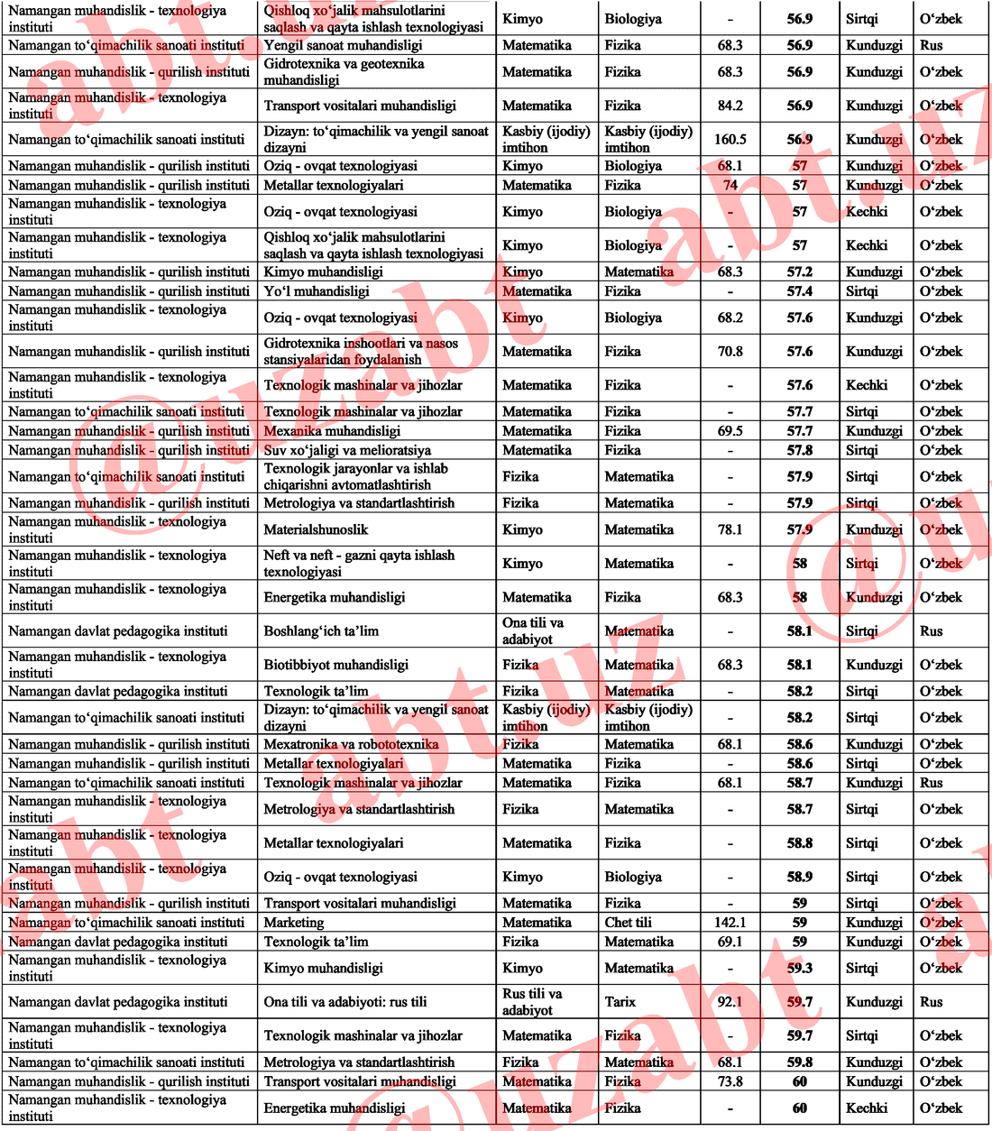 ABT.UZ sayti va @uzabt telegram jamoasi siz abituriyentlarga qulaylik yaratish maqsadida 2024/2025 o‘quv yili uchun NAMANGAN viloyatida joylashgan oliy ta’lim muassasalarida to‘lov kontrakt asosida talabalikka qabul qilishda eng past o‘tish ballarini (56.7 balldan 60 ballgacha) taqdim etadi. Ushbu ballar siz abituriyentlar uchun muhim ko‘rsatkich bo‘lib, tanlov strategiyasini belgilashda asosiy manba bo‘ladi.