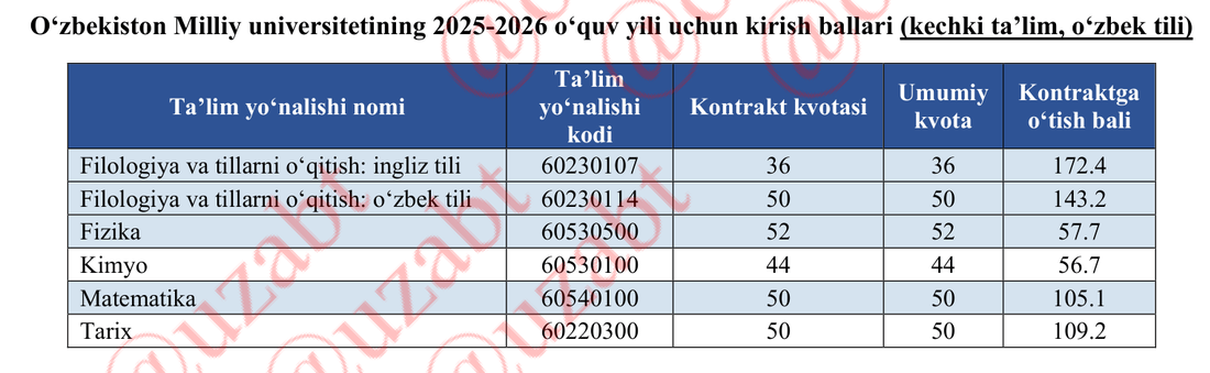 O‘zbekiston Milliy universitetining 2025–2026 o‘quv yili uchun kechki ta’lim, o‘zbek tili segmentida jami 6 ta yo‘nalish bo‘yicha qabul natijalari e’lon qilingan. Ushbu yo‘nalishlarning barchasi kontrakt asosida shakllangan bo‘lib, umumiy kvota ham kontrakt kvotasiga teng. Jami qabul sig‘imi 282 o‘rinni tashkil etgan.