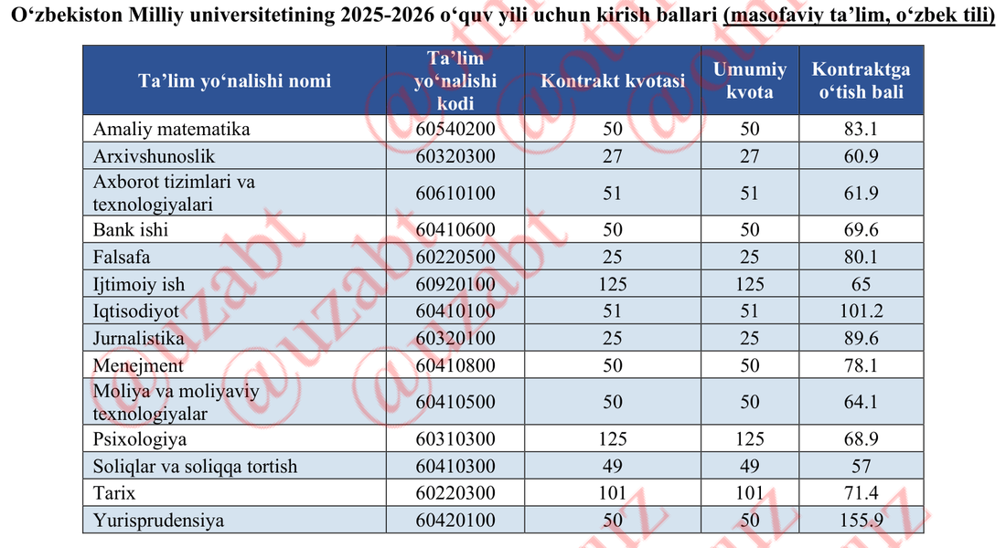 O‘zbekiston Milliy universitetining 2025–2026 o‘quv yili uchun masofaviy ta’lim, o‘zbek tili segmentida jami 14 ta yo‘nalish bo‘yicha qabul natijalari e’lon qilingan. Bu shaklda barcha qabul kontrakt asosida amalga oshirilgan bo‘lib, umumiy kvota ham kontrakt kvotasiga teng. Jami qabul sig‘imi 829 o‘rinni tashkil etgan.