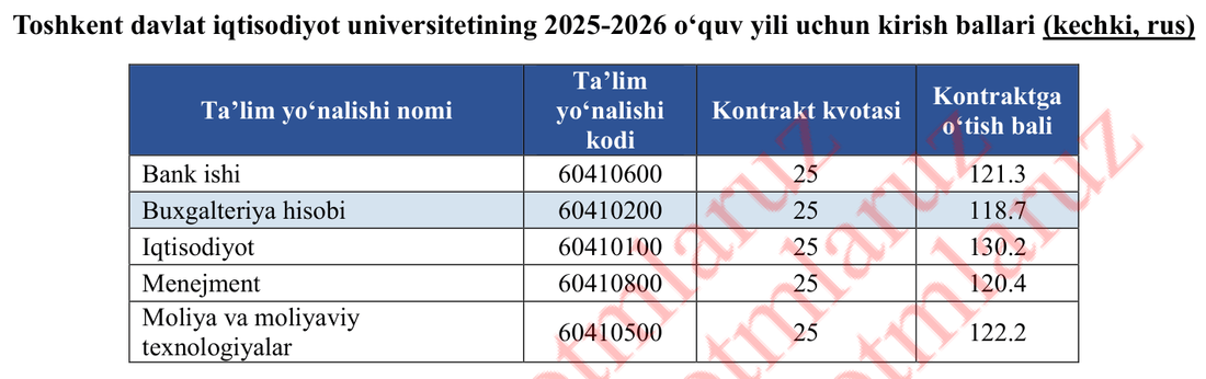 Kechki rus segmentida ham Iqtisodiyot 130,2 ball bilan yetakchi bo‘lib, qolgan yo‘nalishlar 118,7–122,2 oralig‘ida shakllangan. Bu natijalar kechki ta’limda ham iqtisodiyot yo‘nalishi markaziy o‘rinda qolayotganini, lekin kunduzgiga nisbatan raqobat biroz yumshaganini ko‘rsatadi.